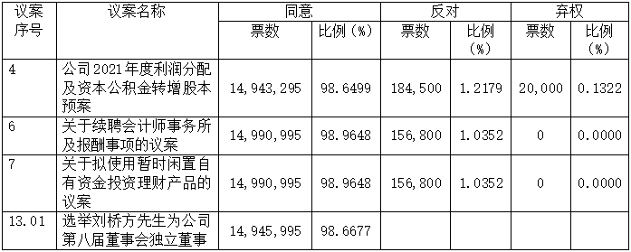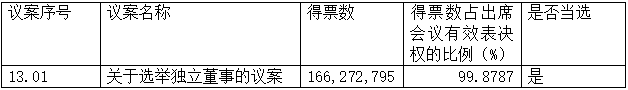 本次股東大會(huì)審議的議案十三采用累積投票制,此議案的表決結(jié)果僅統(tǒng)計(jì)列示表決同意股數(shù)及比例。