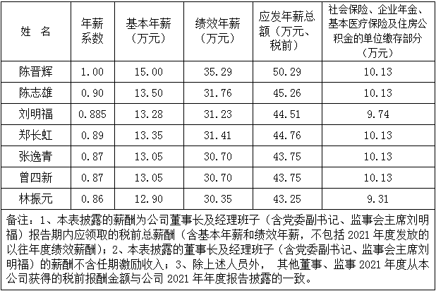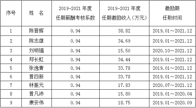 根據(jù)漳州市國資委及《公司董事長、經(jīng)理班子年薪方案》的有關規(guī)定,同意公司董事長及經(jīng)理班子人員(含黨委副書記、監(jiān)事會主席劉明福)2021年度薪酬方案修訂如下: