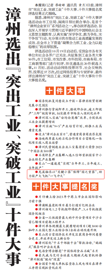 漳州市“突出工業、突破工業”十件大事評選活動經市委、市政府同意,由漳州市工信局、閩南日報社聯合主辦,是首個“漳州企業家日”系列活動之一。評選活動自10月19日啟動以來,共征集到工業各類大事50件,初評擇優遴選出20件候選大事,經網絡投票與專家評審,最終評出漳州市“突出工業、突破工業”十件大事、十件大事提名獎。